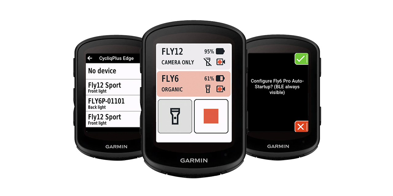 You can power your Fly12 Sport and Fly6 Pro on/off directly from your Garmin Edge unit.